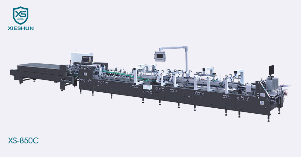 XIESHUN 4/6 कॉर्नर ऑटोमॅटिक हाय स्पीड फोल्डर ग्लूअर मशीन XS-850C डिझाईन फार्मास्युटिकल किंवा कॉस्मेटिक उद्योगांप्रमाणे लहान आणि मध्यम आकाराचे बॉक्स चालवण्यासाठी. सरळ रेषेचे बॉक्स, क्रॅश लॉक बॉक्स, दुहेरी वॉल बॉक्स आणि 4/6 कॉर्नर बॉक्स, पुठ्ठा 200-800g/m² आणि कोरुगेटेड बॉक्स बासरी N/E आणि Flute F ऑपरेट करणे लवचिक आणि सोपे आहे.